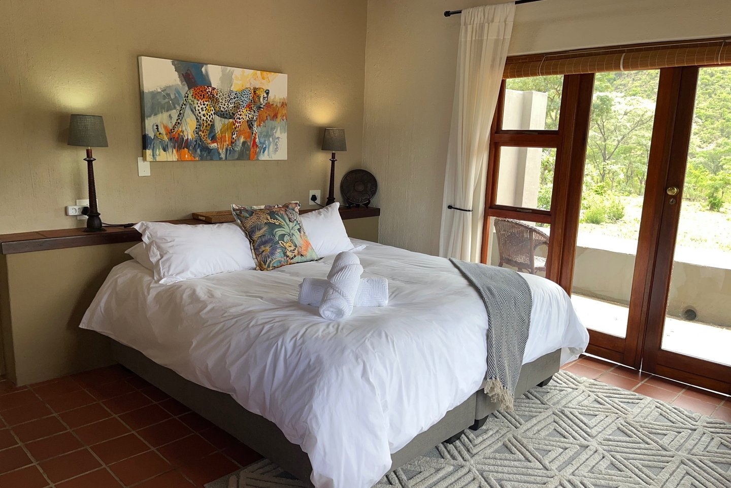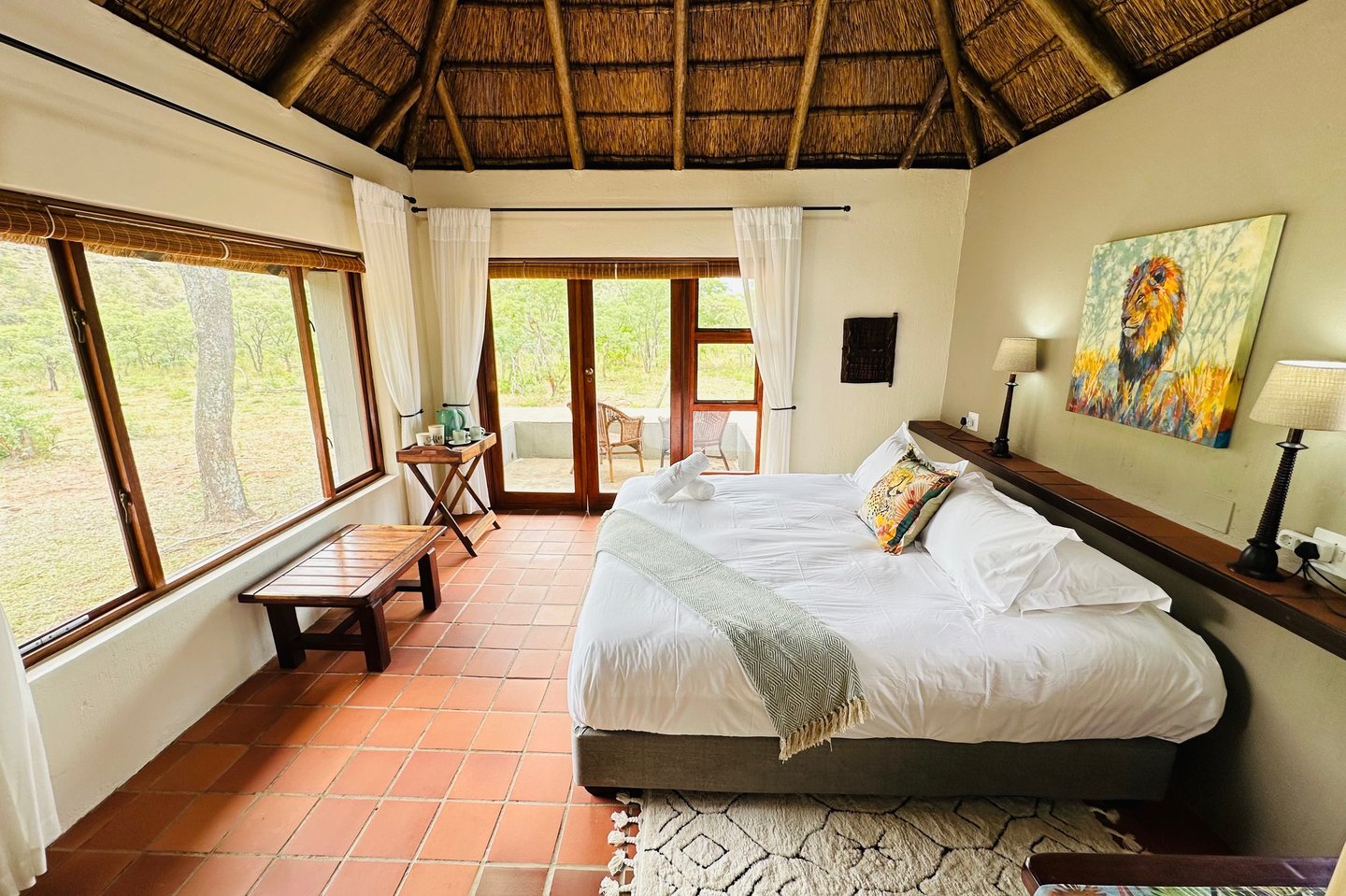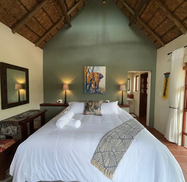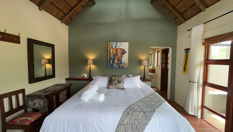 Each chalet has a patio that acts as your own personal hide and is open to the bush allowing for amazing animal encounters. You can sit, lay on top of the thick walls or hang a hammock. The thatch roofs, brick walls, ceiling fans and tiled floors help to keep the rooms at a comfortable temperature year-round. Each chalet has a new plush king XL bed!